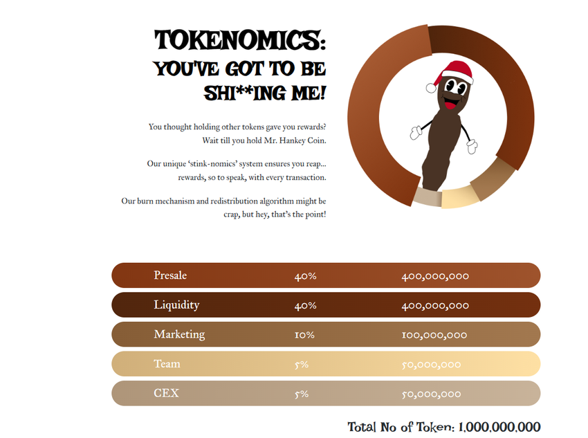 The remaining Mr Hankey Coin supply has been earmarked for marketing (10%), the team (5%) and CEXs (5%).