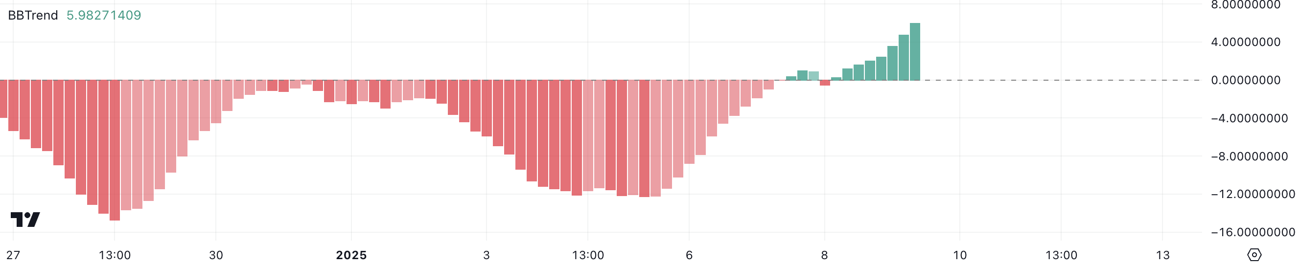 Hyperliquid marked one of the biggest airdrops of 2024 and currently has a BBTrend at 5.9, showing steady growth from 0.27 just yesterday. BBTrend, derived from Bollinger Bands, measures the strength and direction of a trend. Positive values indicate bullish momentum, while negative values suggest bearish conditions.