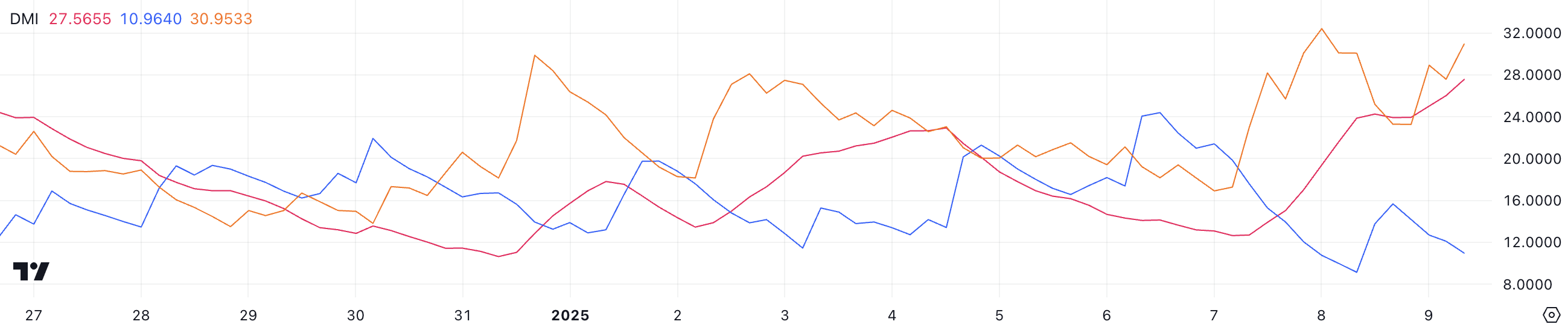 The Average Directional Index (ADX) for HYPE has climbed to 27.5, up from 12.6 on January 7, signaling a strengthening trend. The ADX is a technical indicator that measures the strength of a trend, regardless of its direction, on a scale from 0 to 100. Values above 25 indicate a strong trend, while those below 20 suggest weak or absent momentum.
