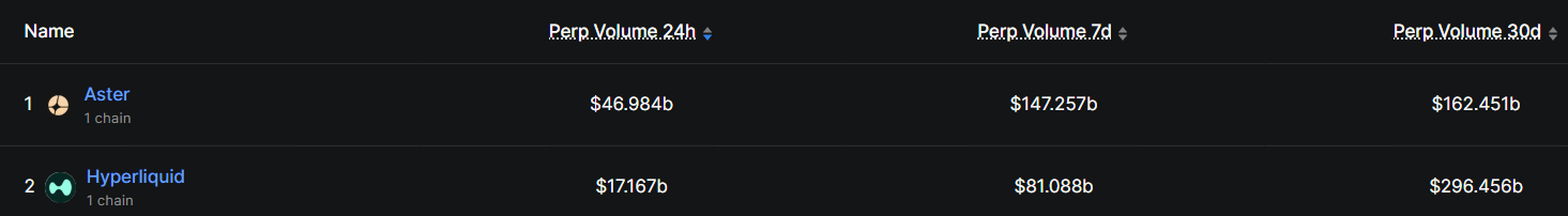 Still, Hyperliquid remains the larger platform on a 30-day basis, recording $296 billion in cumulative volume versus Aster’s $162 billion.