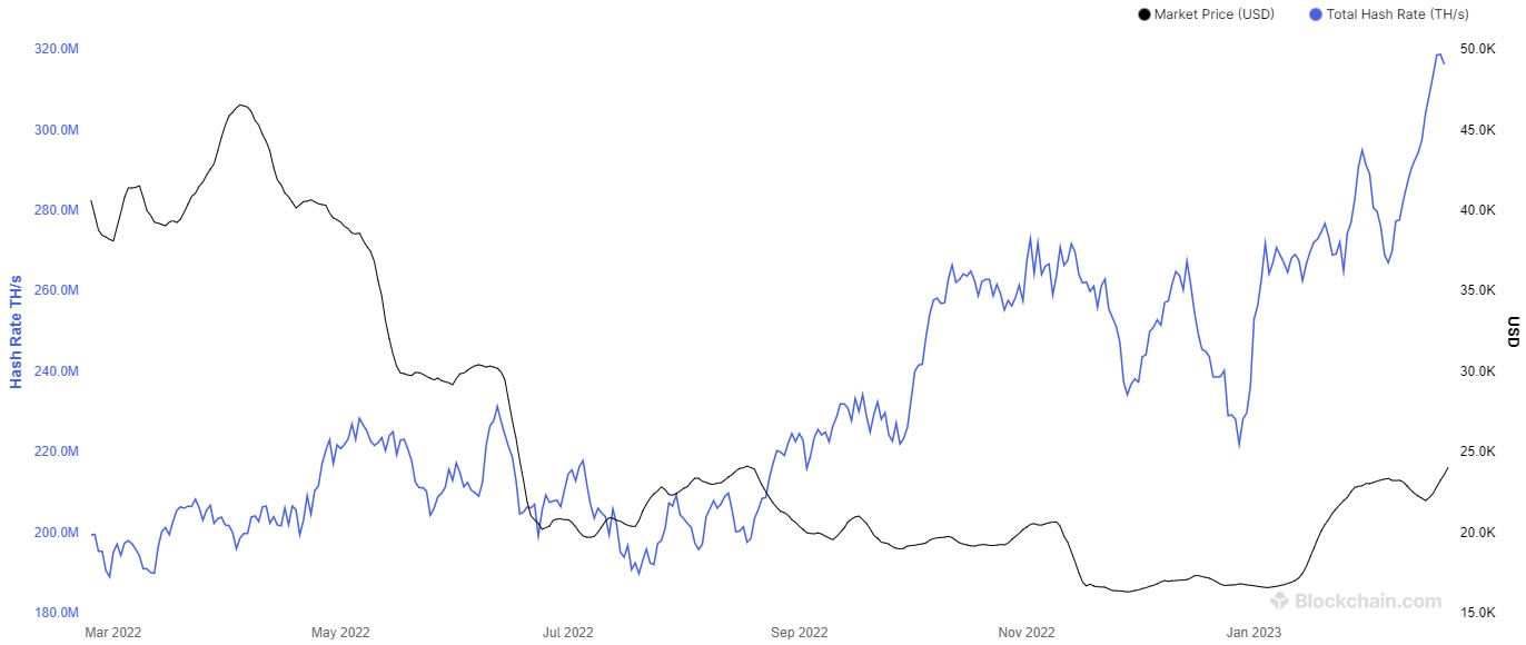 Network hash rate hit an all-time high of 318 exahashes per second (EH\s) this week, according to Blockchain.com. It is currently hovering just below those levels after increasing by 25% since the beginning of this year.