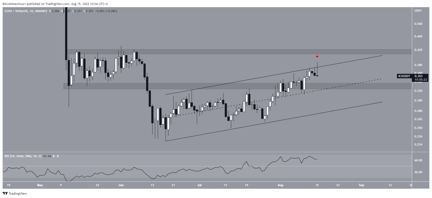 Despite this rejection, the daily RSI is above 50, and the price is trading in the upper portion of the channel and above the $0.33 horizontal support area.Â