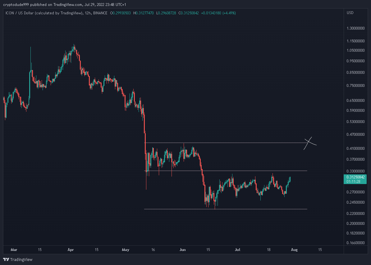 Technical Analyst @Cryptodude999 tweeted a chart of ICX, stating that the price is trading inside a short-term range with resistance at $0.33.
