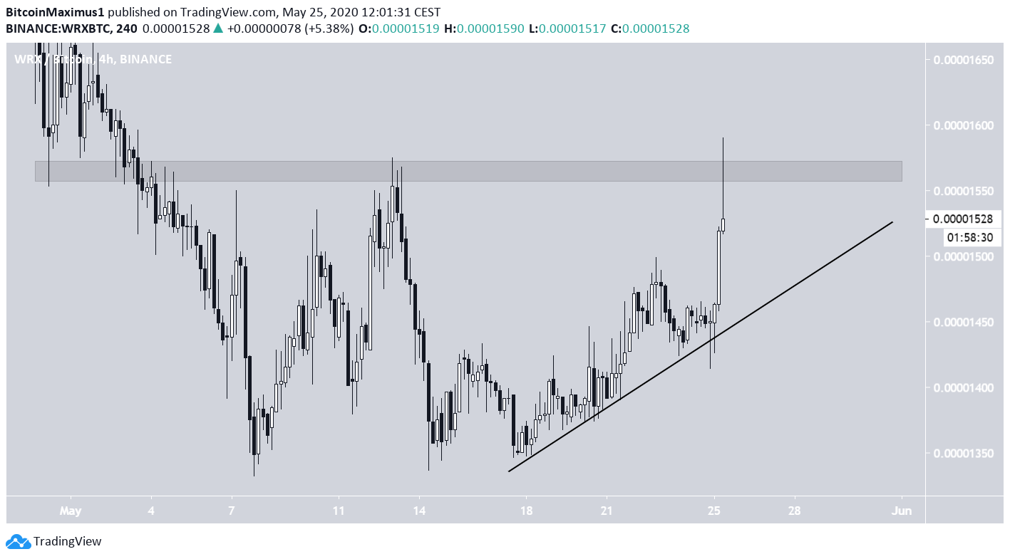 In the short-term, WRX is following an ascending support line and was just rejected by the 1,570 satoshi resistance area, creating a long upper wick.