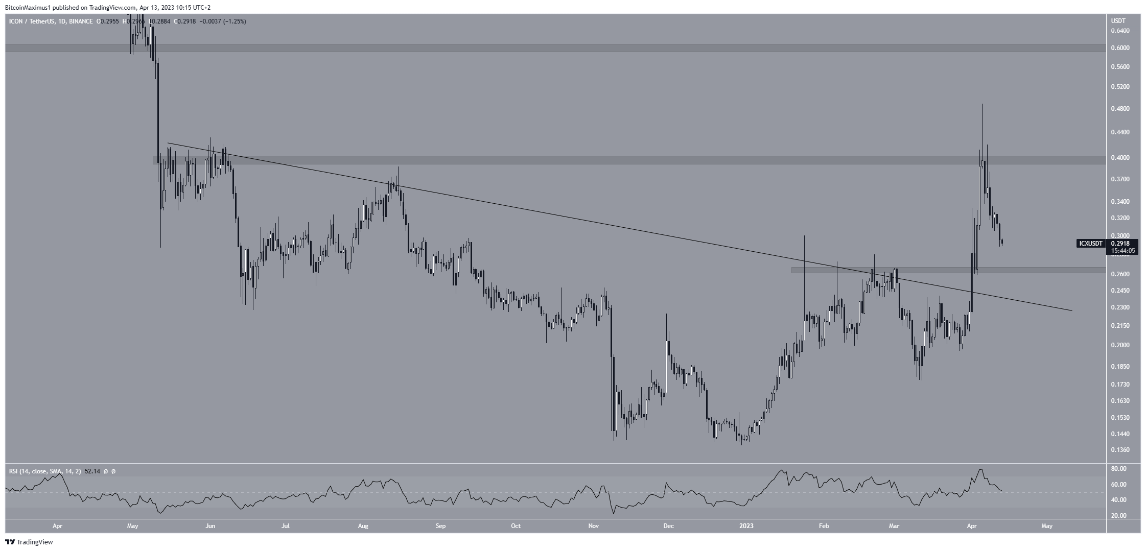 The ICX price broke out from a descending resistance line on April 1. It reached a maximum price for the year at $0.49 four days later. However, while this seemingly caused a breakout above the $0.40 resistance area, the price created a long upper wick during the next 24 hours and fell afterward. Such wicks are considered signs of selling pressure.