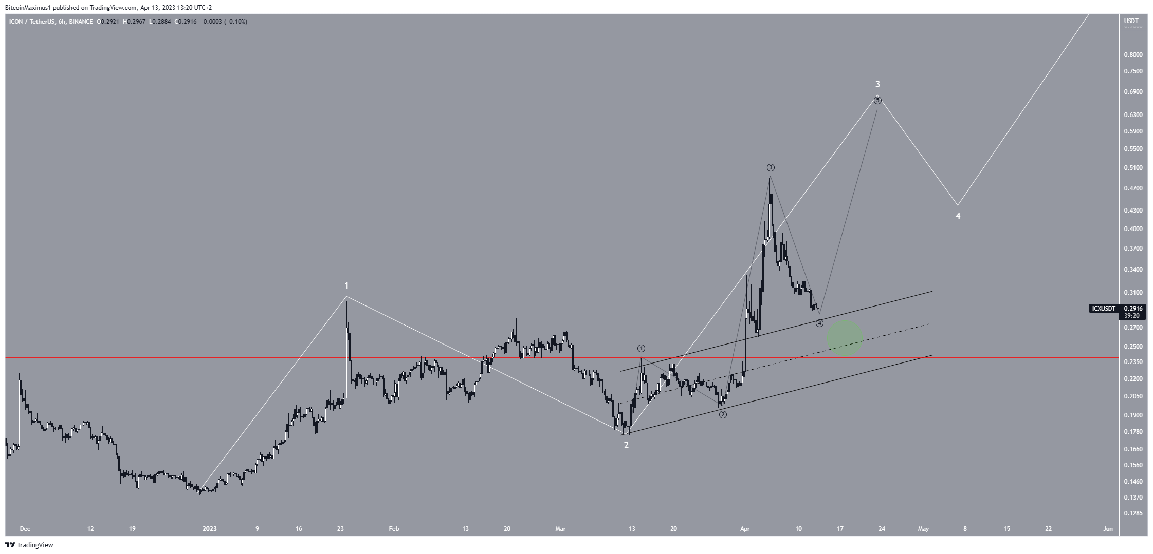 The ICX price is in wave three of a five-wave upward movement (white). This is usually the sharpest out of the five waves. The sub-wave count is given in black, showing that the ICON price is completing a fourth wave pullback. The pullback may end at the middle of the previous ascending channel (green circle), which also coincides with the $0.26 horizontal support area. Afterward, the ICX price could increase to the long-term resistance at $0.60.Â