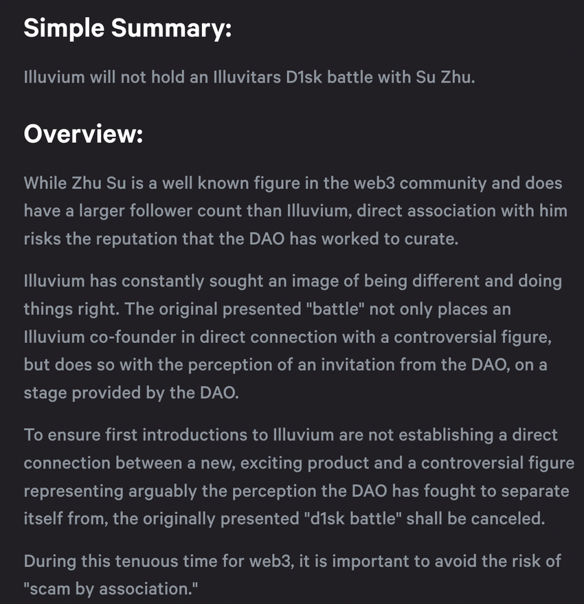 The proposal to cancel Zhu reads, “Illuvium has constantly sought an image of being different and doing things right. The original presented “battle” not only places an Illuvium co-founder in direct connection with a controversial figure, but does so with the perception of an invitation from the DAO, on a stage provided by the DAO.”