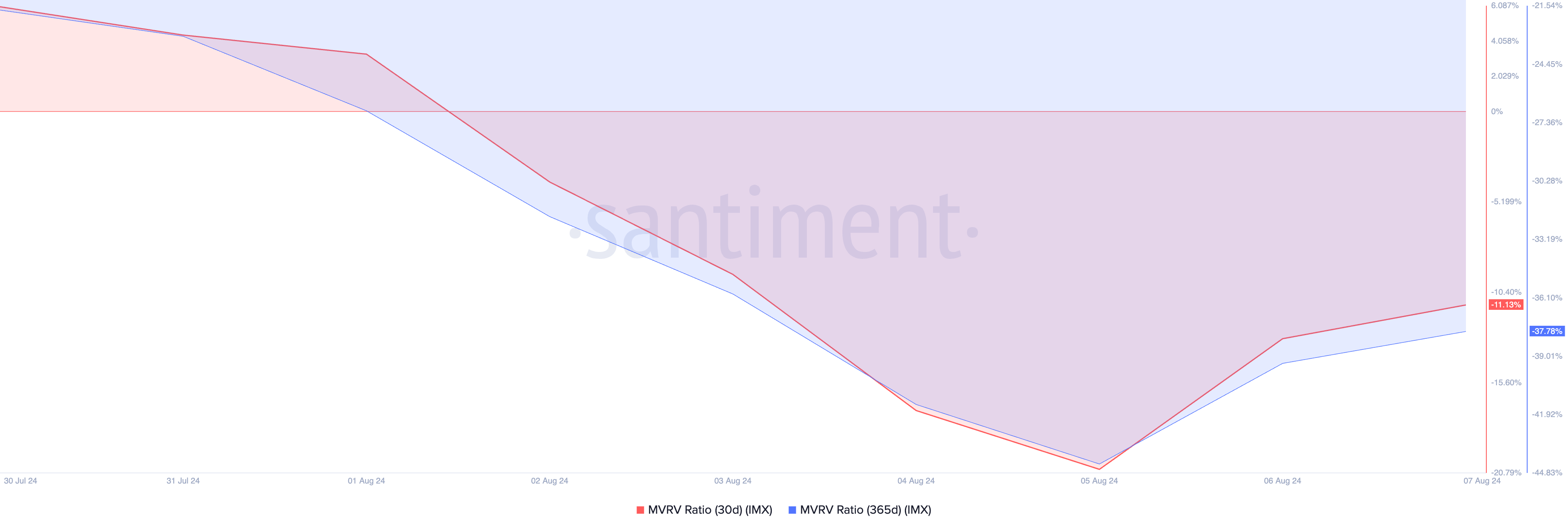 For traders looking to trade against the market, IMX’s market value to realized value (MVRV) ratio has flashed a buying opportunity. This metric returns negative values when assessed over different moving averages. According to Santiment, IMX’s 30-day and 90-day MVRV ratios are -11.13 and -37.78, respectively.