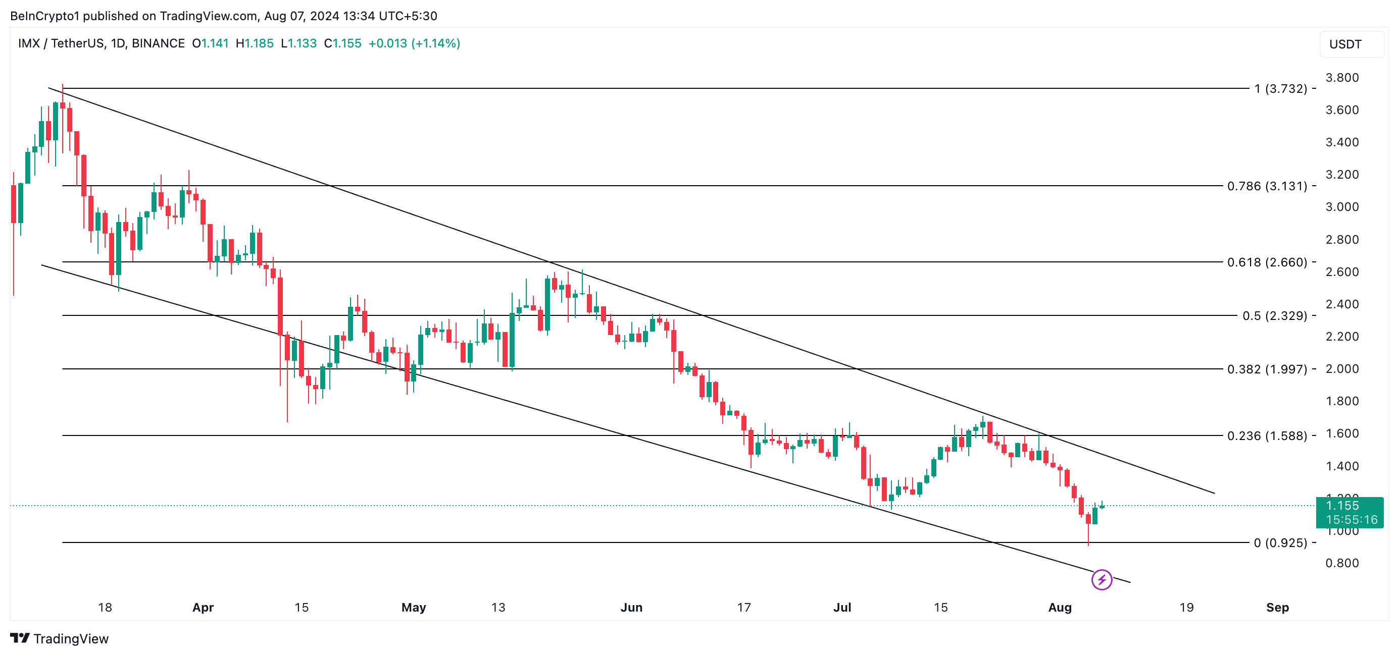 If IMX continues to trend within this channel, its price might fall to $0.92 and aim for the lower line, which currently forms support at $0.67.