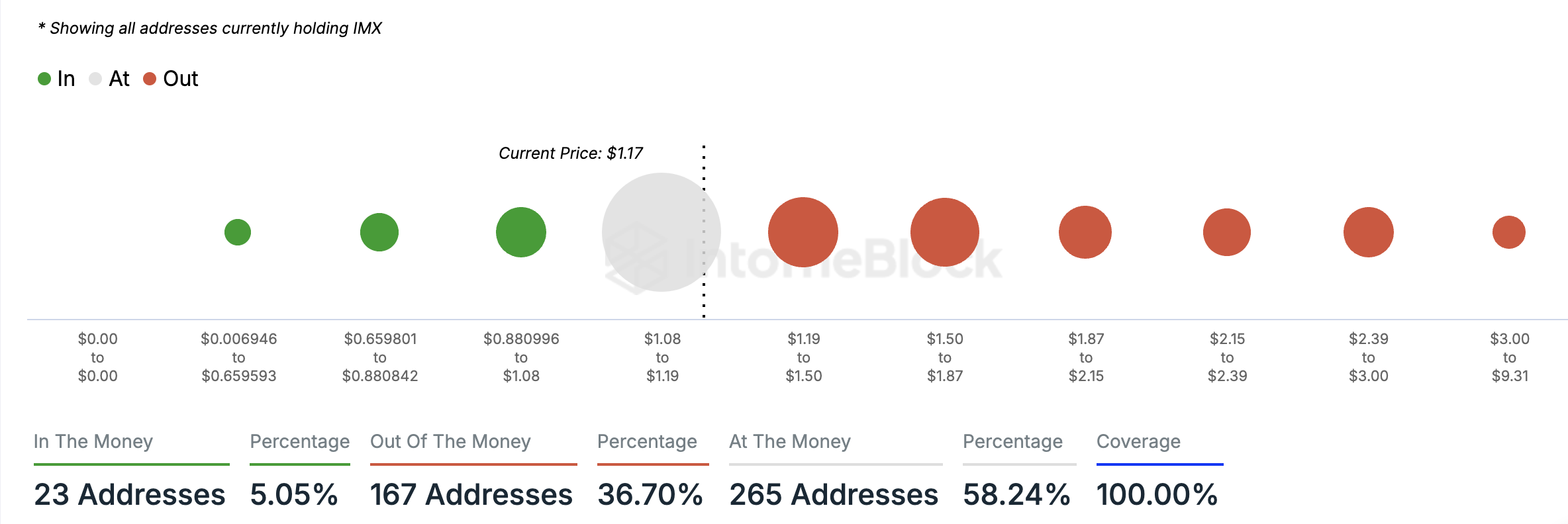 An assessment of the latest data for IMX’s Active Addresses by Profitability has revealed that 167 addresses comprising 37% of the altcoin’s daily active addresses are “out of the money.”