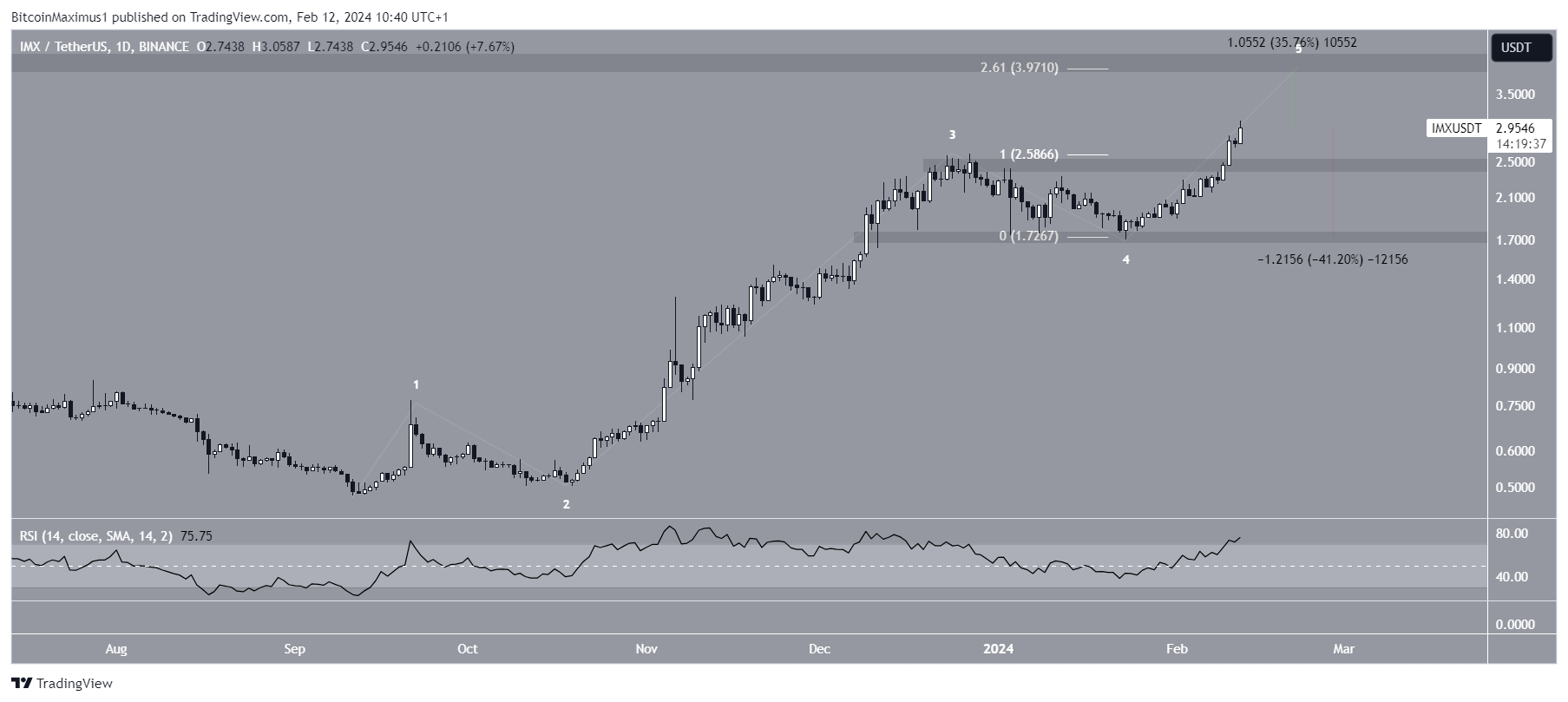 If IMX continues increasing, it will reach the next horizontal resistance at $4, coinciding with wave four’s 2.61 external Fib retracement. This will be an increase of 35% from the current price.
