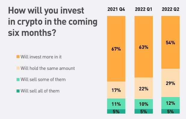 As for the reasons behind investing in the crypto market itself, 56% believe that crypto represents the future of finance, and 54% believe that they will get a good return in the long run. 43% are investing for short-term gains, while 24% consider crypto a “hype for fun.”