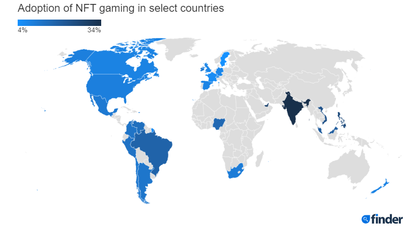 Finder say their report reveals that, “P2E is on the rise globally, with adoption set to grow 10% on average.”Â