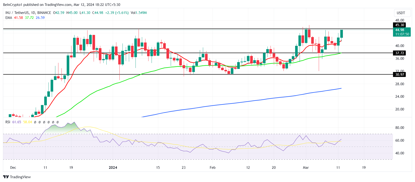 Trading at $48, the Injective price has broken out of the resistance and support sandwich it had been stuck in for months. Between $45 and $30, INJ was mostly consolidated, failing to breach the barrier.