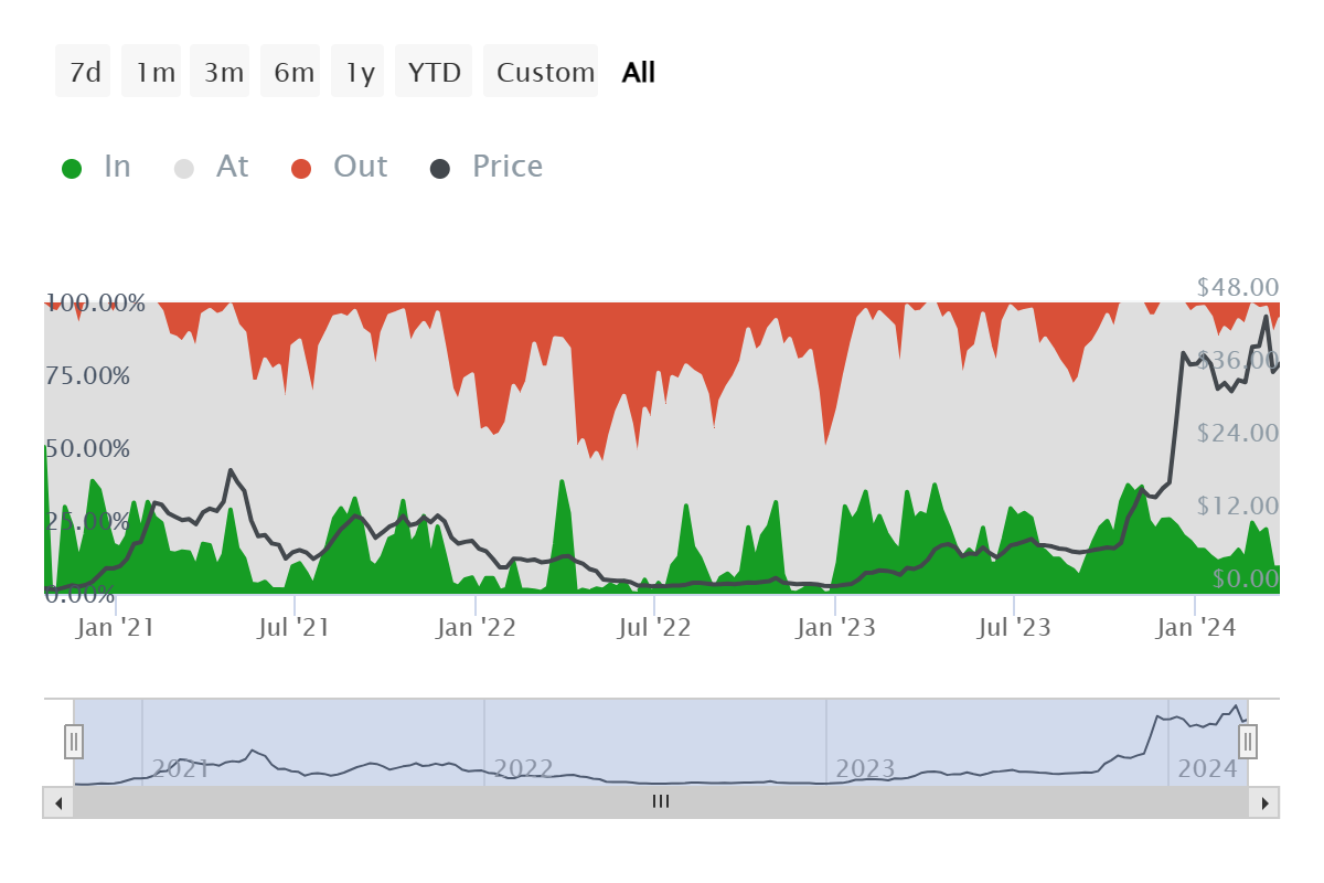 These investors are presently breaking even and are waiting for the price to shoot up in order to find profits. Their activeness shows that INJ holders are still optimistic about the Injective price rising further, which will boost the bullish momentum.
