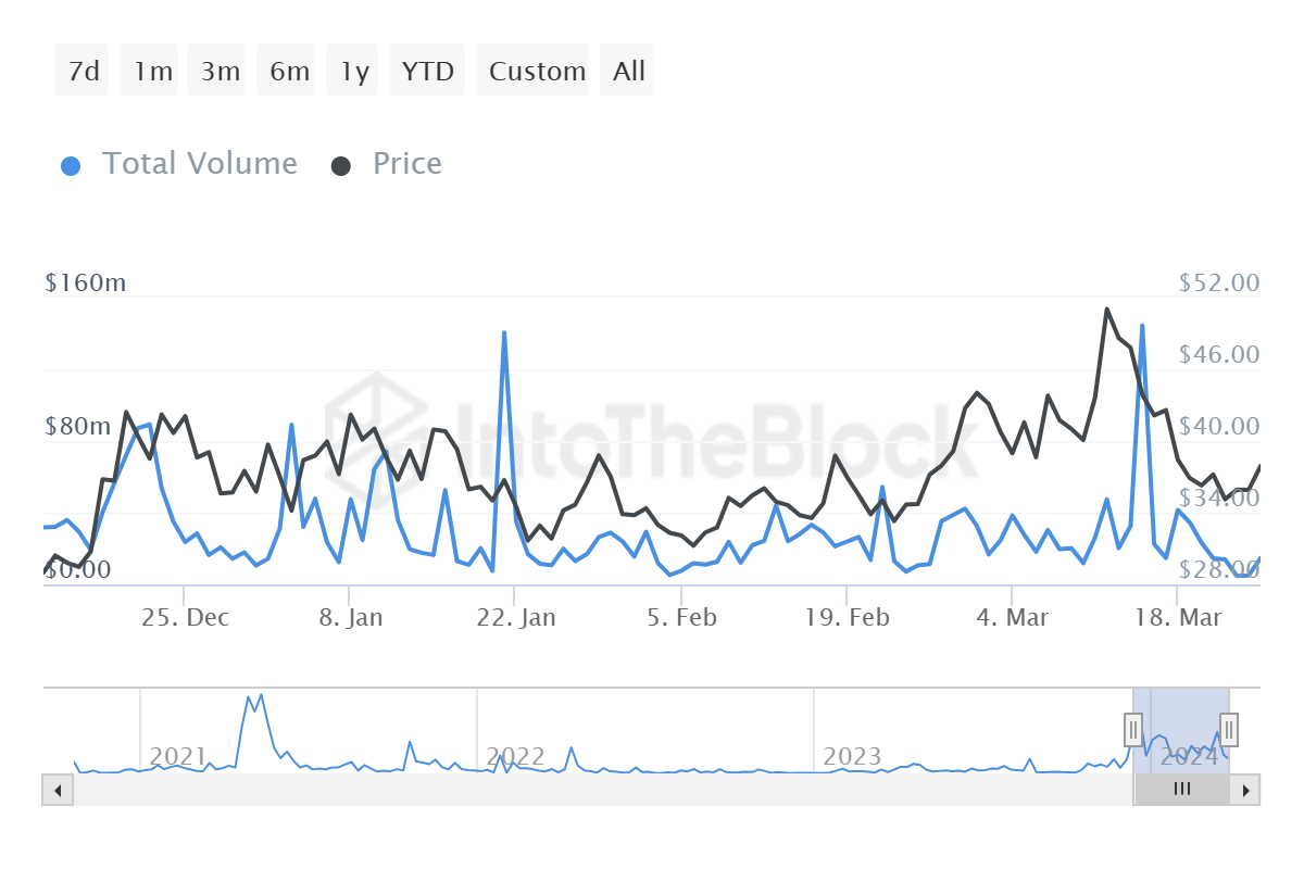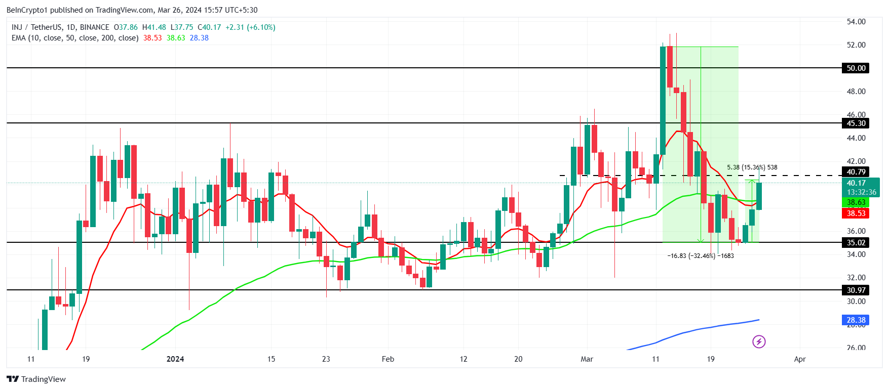 Injective price is currently trading at $40.17, up from $35.02 just 72 hours ago. This has given bullish signs for investors once again, who were reeling from the 32% correction observed since mid-March.