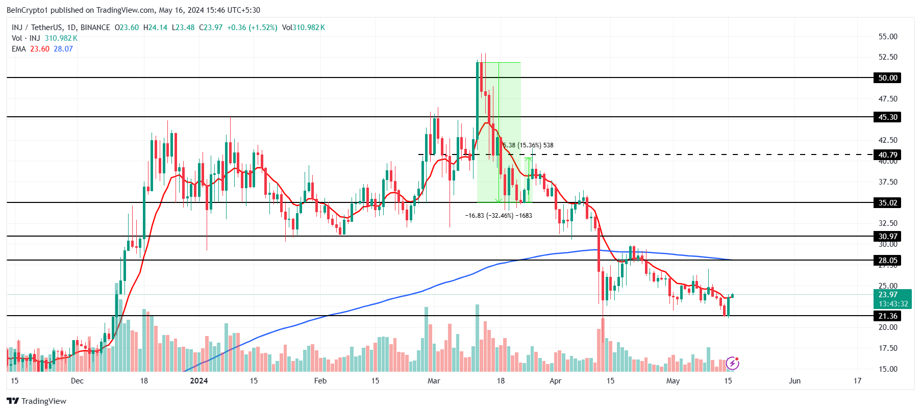 This would enable Injective’s price to note a recovery over the next few trading sessions, bringing it closer to the recovery target of $28.0. This price aligns with the 200-day Exponential Moving Average (EMA).