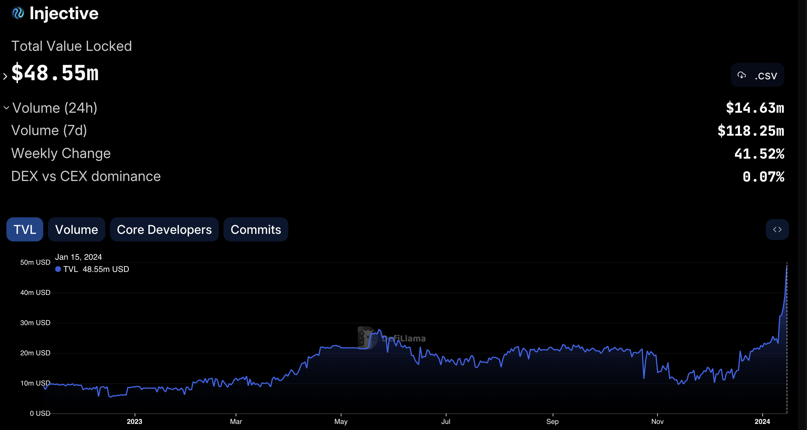 The total value locked (TVL) on Injective’s decentralized finance marketplace grew a staggering 42% to $49 million in the last 24 hours. Dojoswap, a decentralized exchange on the network, saw an influx of $27 million alone.