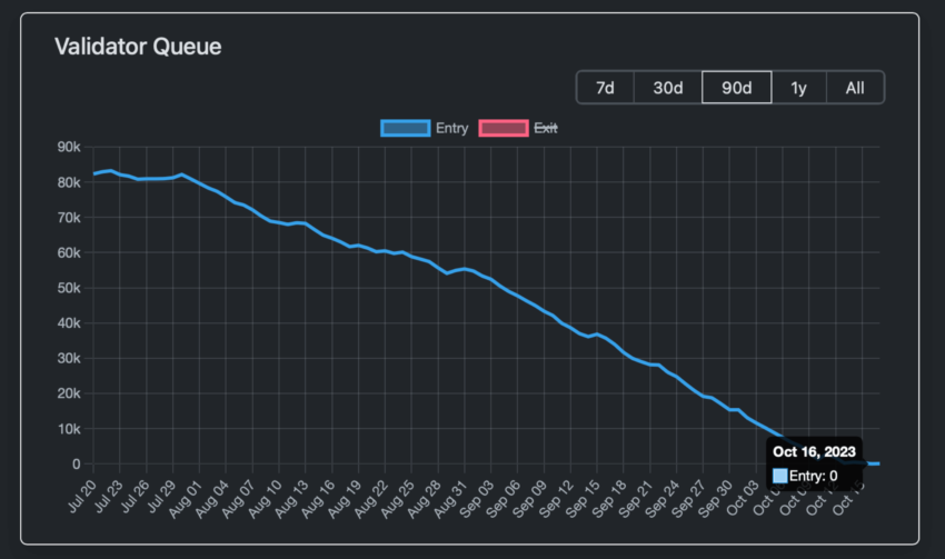 This week, the queue of people wanting to act as Ethereum validators has shrunk to zero. This is an incredible deviation from the peak on June 10, 2023, when there were 96,508 validators in the staking queue.