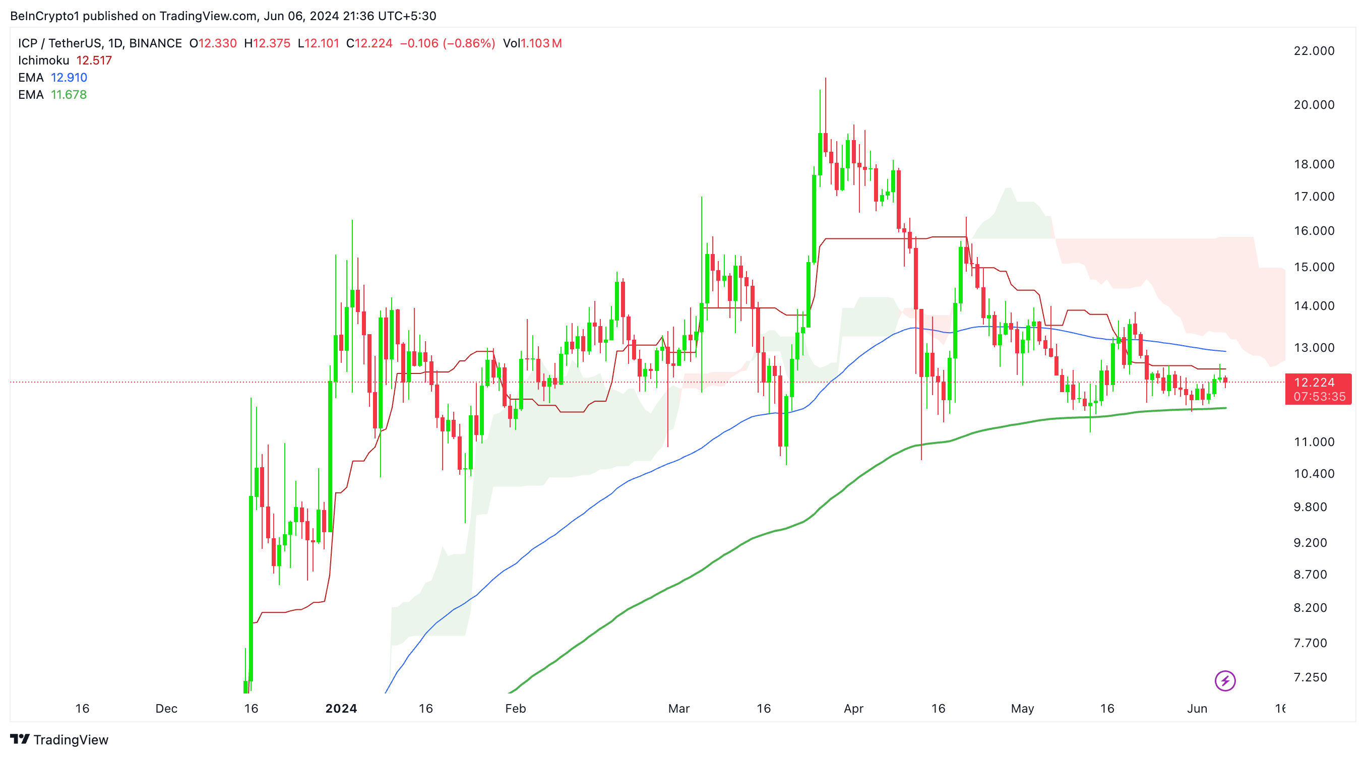 SponsoredICP continues to trade between the 200-day EMA as support and the 100-day EMA as resistance. Within this range, the price also interacts with the red baseline of the Ichimoku Cloud, which serves as mid-term resistance.