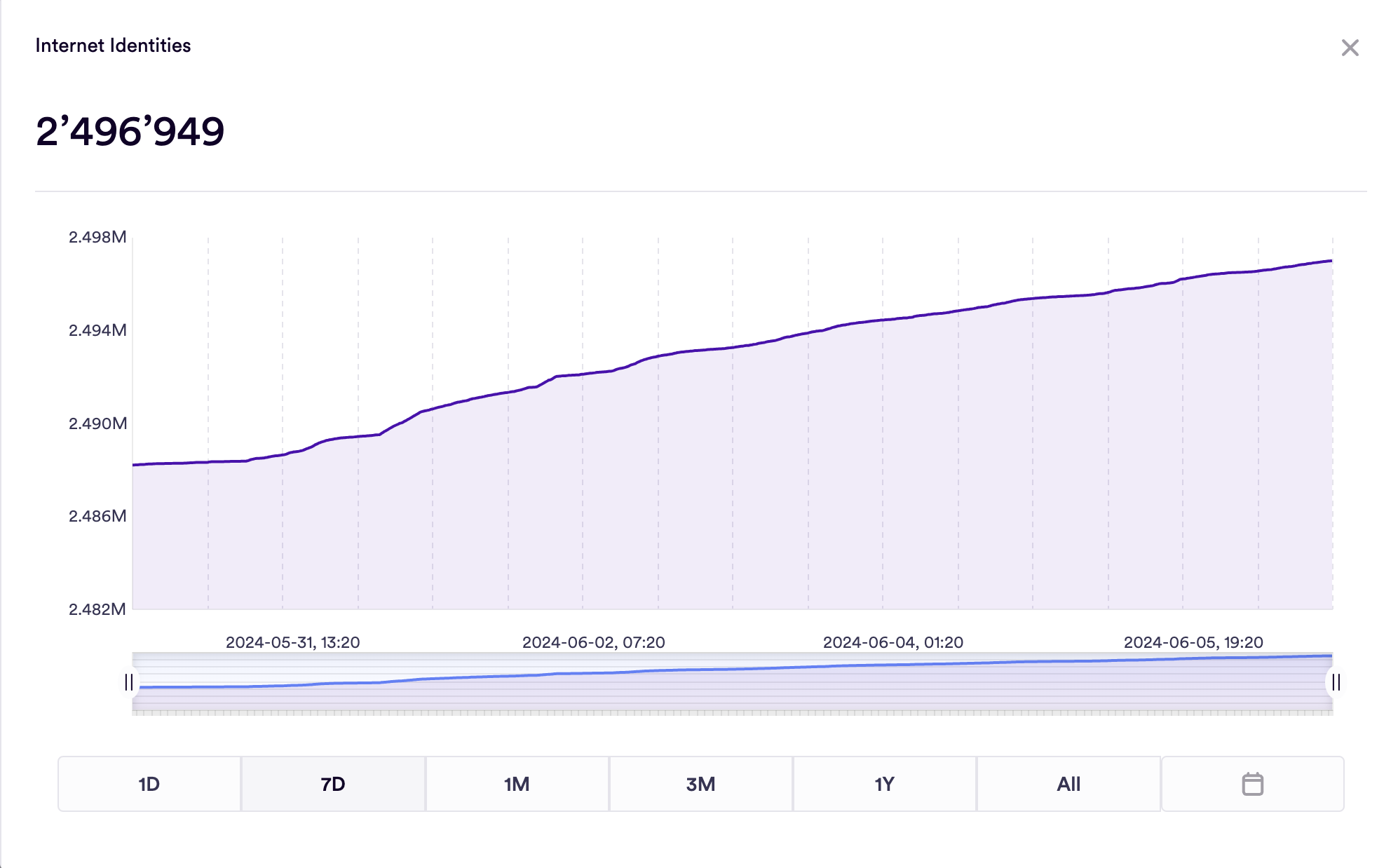 The number of internet identities has steadily increased over the observed period. The average daily growth rate is approximately 2,500 identities per day, and the overall percentage growth over the 6-day period is around 0.60%.