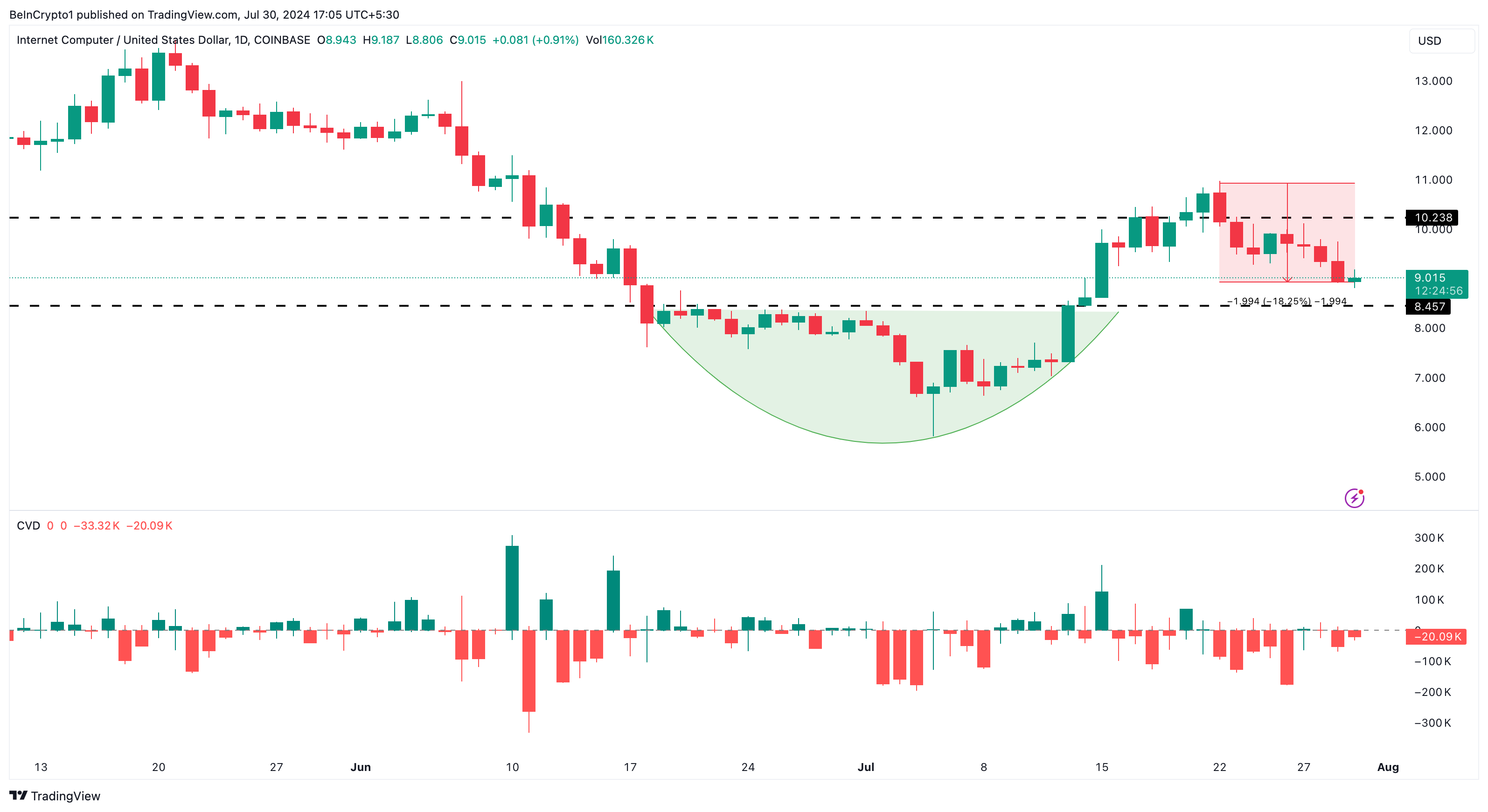 This technical pattern is one reason ICP climbed to 10.95 on July 22. However, the token has now erased a chunk of those gains. From the chart below, bulls attempt to prevent ICP from dropping below $9.