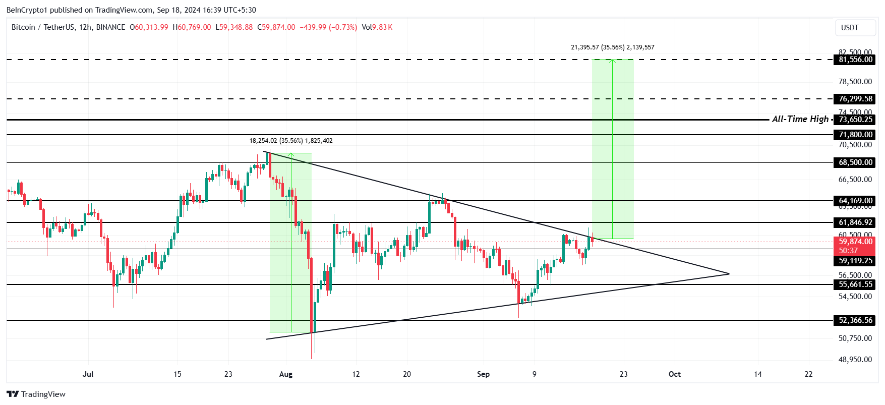 Bitcoin is currently trading just below the $60,000 mark and is on the verge of breaking out of the ascending triangle pattern. If Bitcoin successfully flips $64,169 into support, the pattern suggests a potential 35% rise, propelling BTC to $81,556. This breakout, however, will require strong bullish momentum.