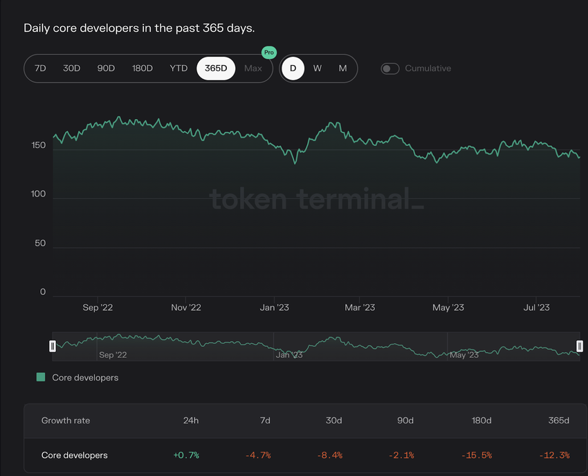 While Cardano plans to bring many applications and use cases into the ecosystem, its core developers are declining. The screenshot below shows that the core developers have declined by around 12.3% in the past 365 days.