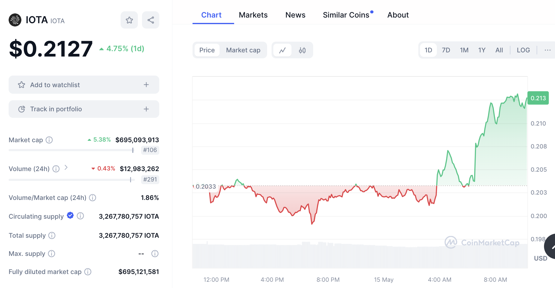 Following the announcement, IOTA’s native token had a mini rally, going from $0.21 to $0.23, a rise of roughly 5%. However, the token has traded with a weekly loss of 3.81% and a monthly loss of 4.95%. At the time of writing, IOTA’s price is back to $0.21.
