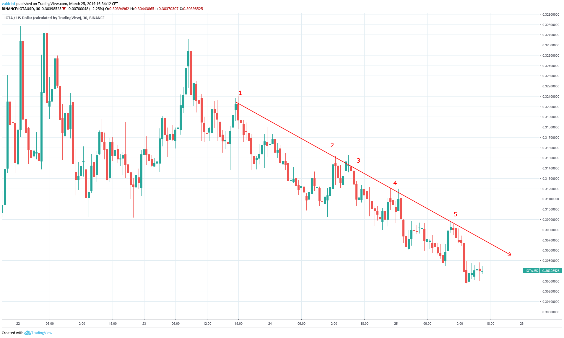 On March 22, 2019, the price of IOTA (IOTA) reached a high of nearly $0.34. A sharp drop ensued, followed by an upward move and another gradual downtrend.