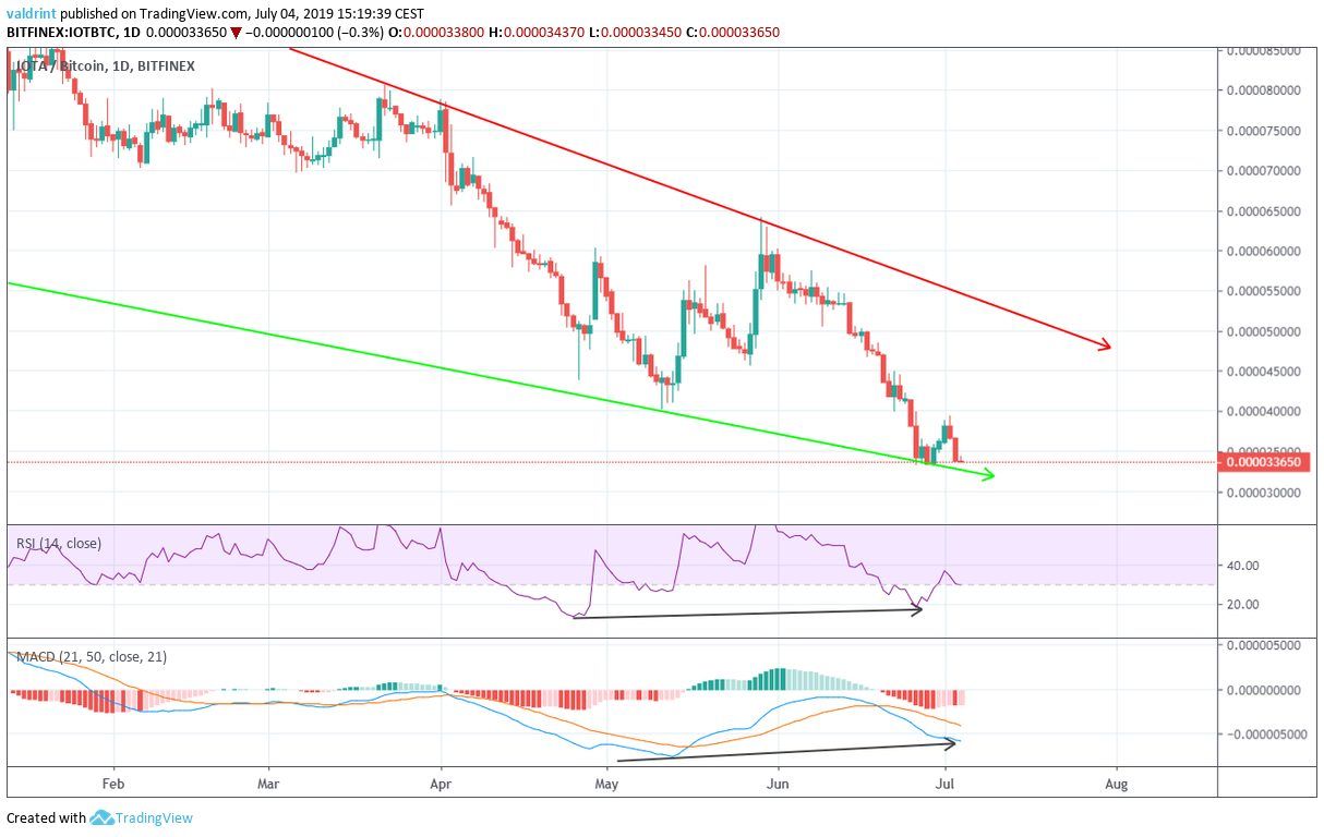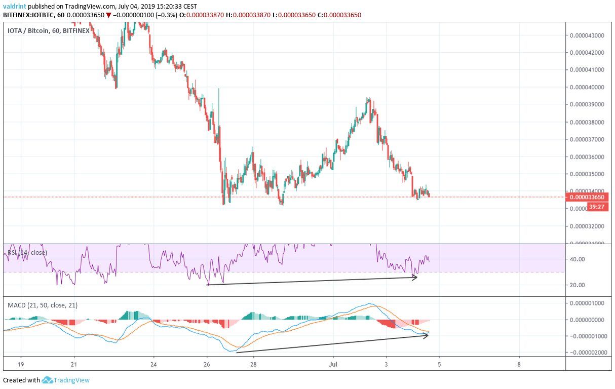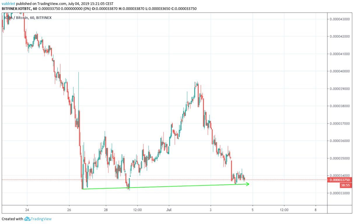 On June 26, 2019, the price of IOTA (MIOTA) reached a low of 32,200 satoshis. Similar lows were reached on June 29. After a gradual increase, the IOTA price again dropped to these levels on July 4.