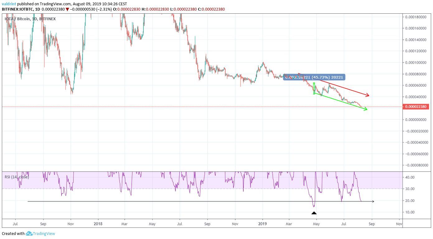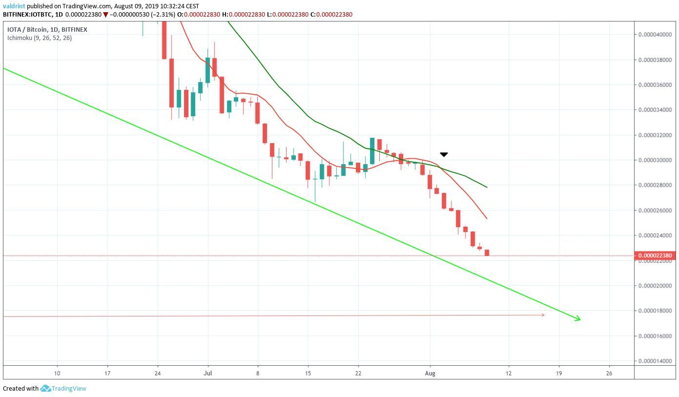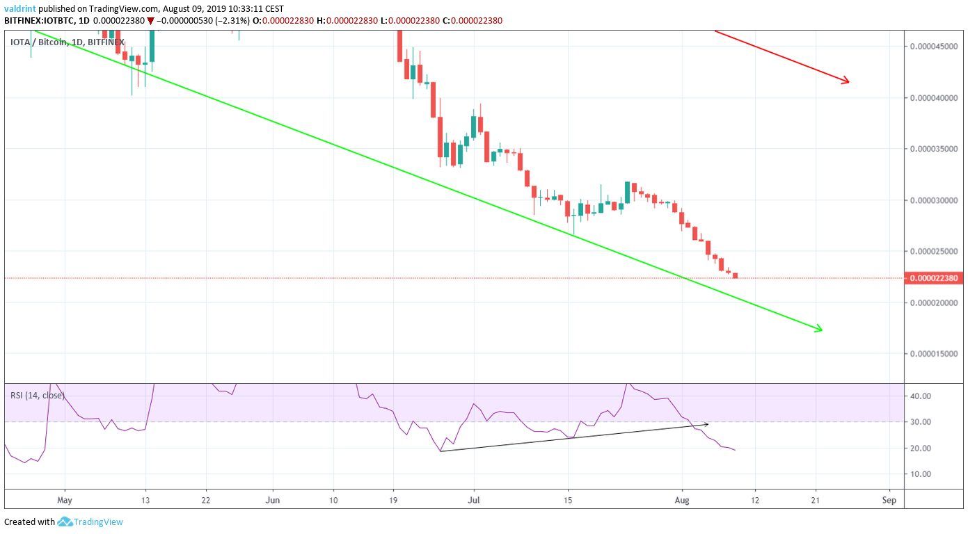 On July 2, 2019, the IOTA price reached a high of 39,400 satoshis. A downtrend ensued which is still in effect. While the price made an attempt at a reversal in the period from July 16-25, it ultimately proved unsuccessful.