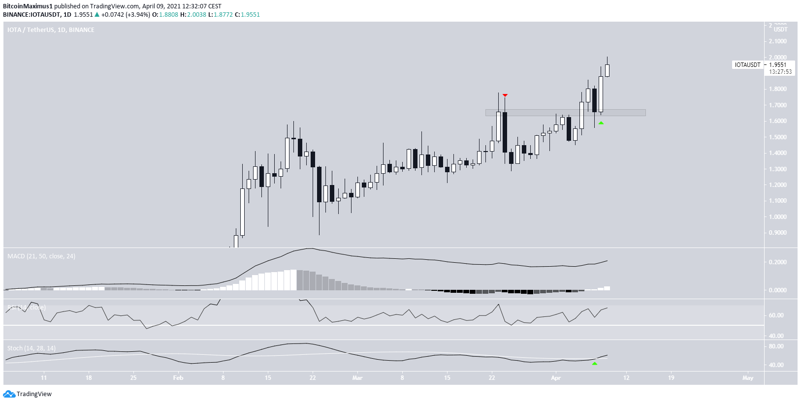 On Feb. 19, IOTA reached a high of $1.70. While it has been moving upwards, the first portion of the move seemed to be corrective rather than impulsive.