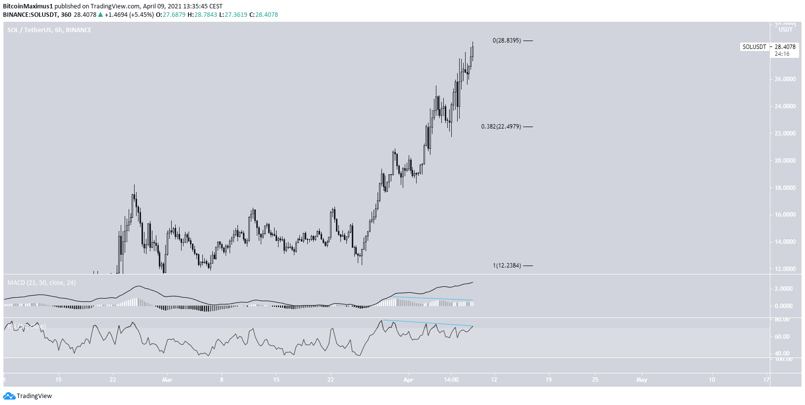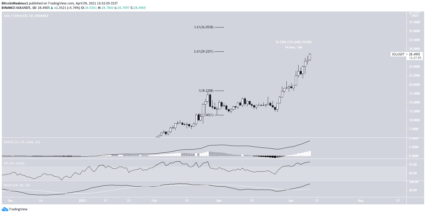 SOL has been moving upwards since March 16. So far, it has done so by 131% in only 14 days, culminating with an all-time high price of $28.78 on April 9.