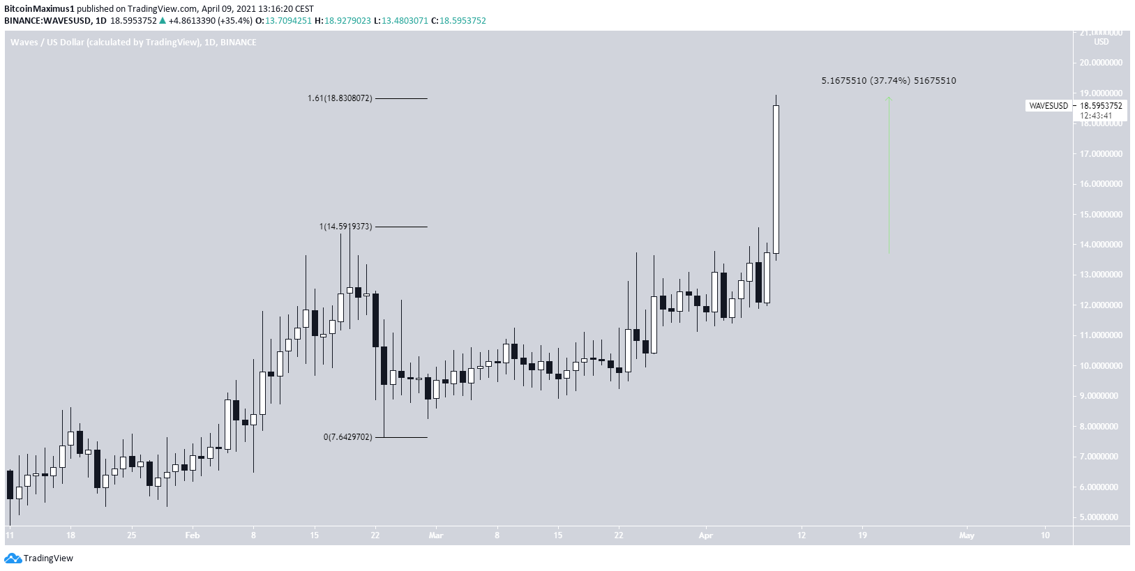 On April 9, WAVES managed to break out. Currently, it is trading right at the 0.786 Fib retracement level at $18.40. If it successfully manages to move above this level, the token would find the next resistance at its all-time high of $23.45.