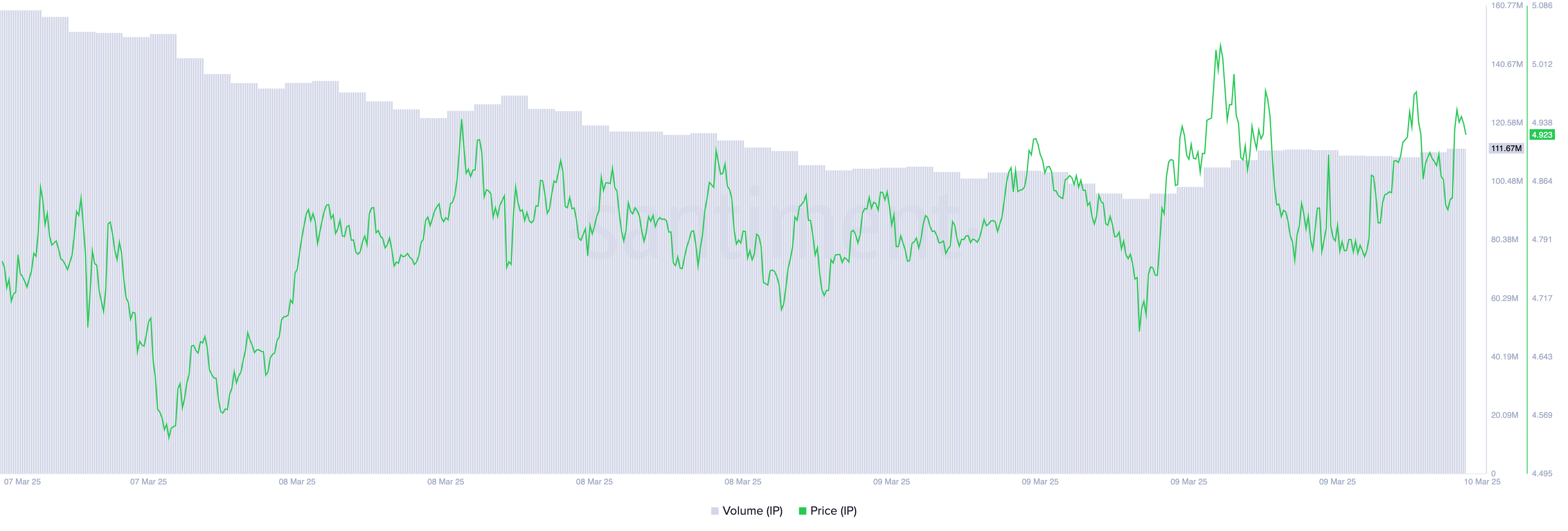 IP’s daily trading volume has surged by 53% in the past 24 hours, reaching $159.47 million. This spike comes despite a broader market downturn, which has wiped out $148 billion from the total crypto market capitalization over the same period.