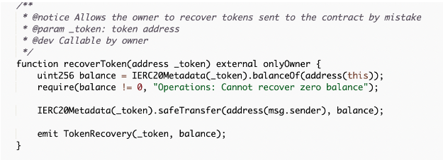 The function has an accessibility “onlyOwner” that allows only the deployer of the address to recover the tokens sent to the contract.