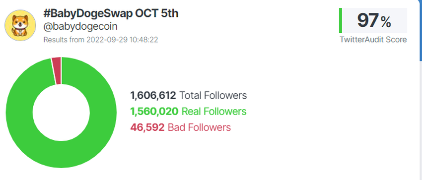 One metric which can be measured is the number of “real” and “fake” Twitter followers a project has. According to TwitterAudit, Baby Doge scores a healthy auditing score percentage of 97%. This would tend to suggest that more of its followers are organic rather than bots.