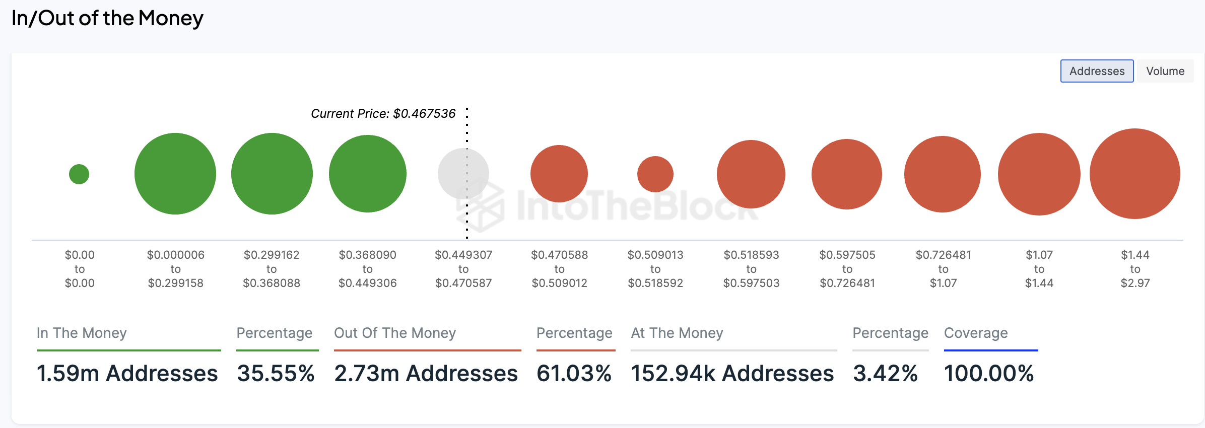 For example, between $0.59 and $0.72, 6.78 billion ADA was purchased by over 367,000 wallet addresses. This price range could likely see increased activity as holders attempt to recover their initial investments.