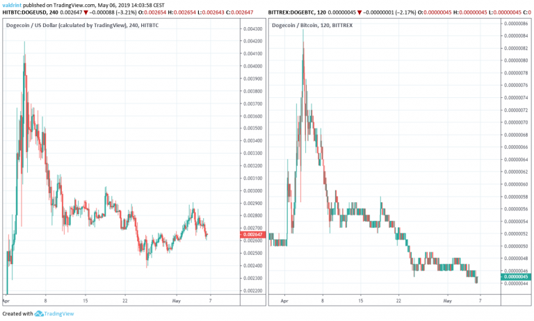 On Apr 18, 2019, the price of Dogecoin (DOGE) reached a high of 58 satoshis and $0.0033. Since then, it has been decreasing, reaching lows of $0.0024 and 45 satoshis on Apr 25.