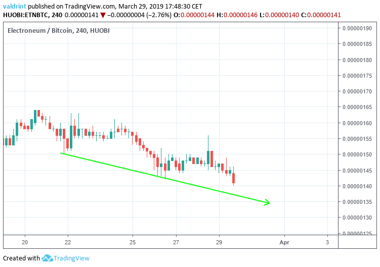 The price of ETN made a high of 164 satoshis on Mar 20. A gradual downtrend ensued. The price has made several lower highs. Tracing these highs gives us a descending resistance line.