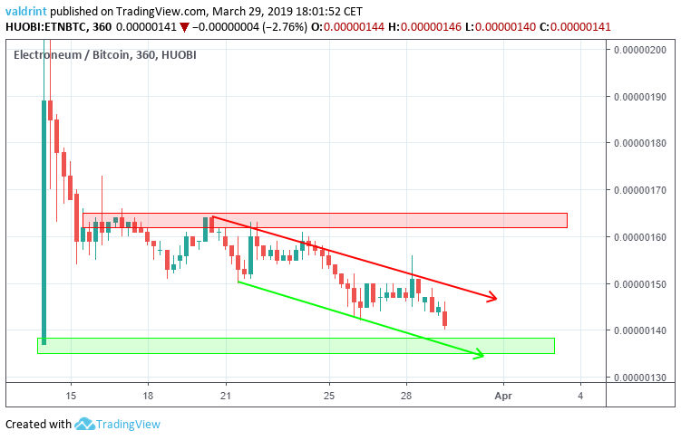 The price of ETN on Huobi is analyzed at six-hour intervals from Mar 14 to Mar 29 in order to better visualize possible reversal areas. Resistance and support areas are used.