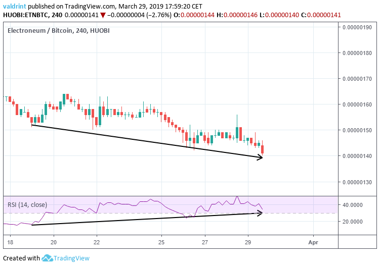 On Mar 19, the price made a low of 151 satoshis. It has proceeded to make lower lows since. Similarly, the RSI made the first low on Mar 19. However, it has continued to generate higher values.