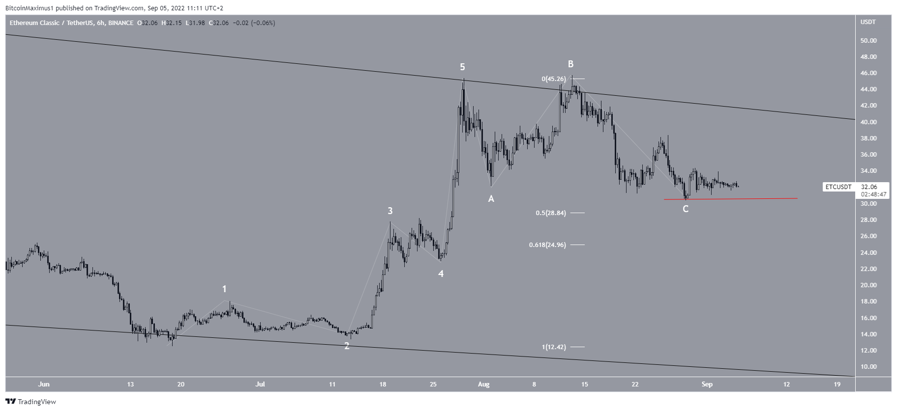 The wave count shows that ETC has completed a five-wave upward movement (white) that ended with the $45.36 high of July 29. Since then, it has been decreasing inside what is likely to be an A-B-C corrective structure. Since waves A:C have had a 1:1 ratio, it is possible that the correction is complete.
