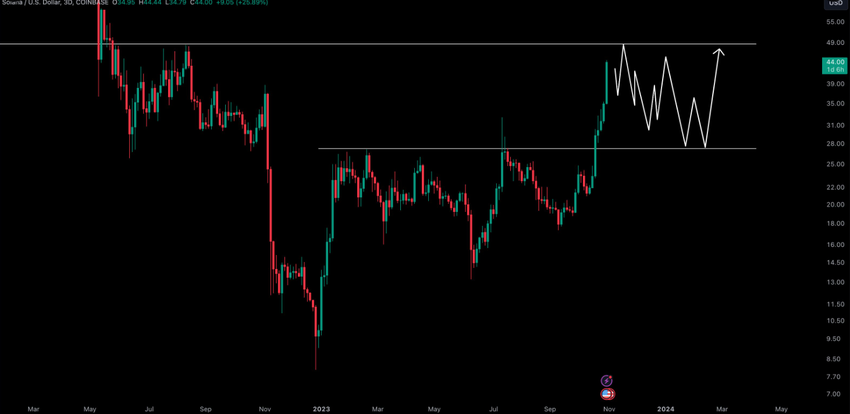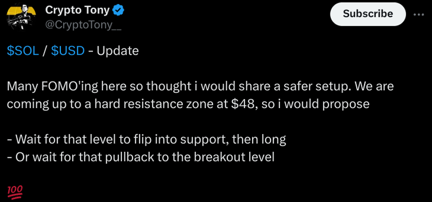 The analyst illustrated his predicted trajectory on the Solana price chart, forecasting a rejection of the September 2022 $48 resistance and a pullback to the recent bear market resistance.