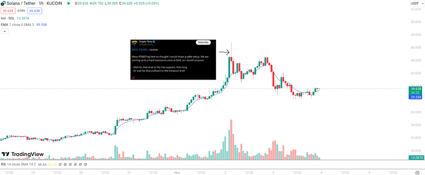 Currently, Solana is priced at $38 after peaking on November 1 at almost $47 yesterday on some exchanges. This has been a significant run for Solana as it reached its highest price in over one year. However, recent price action indicates the tide may be turning, an idea shared by analyst Crypto Tony.