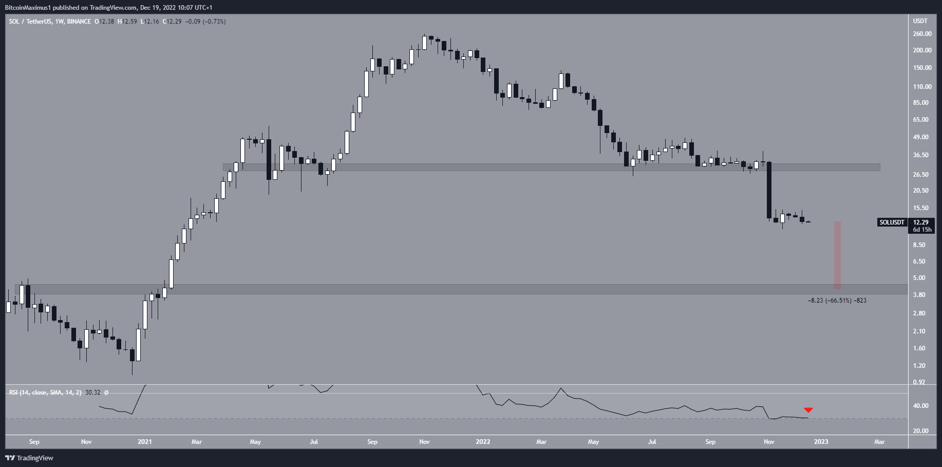 The Solana price has fallen since Nov. 2021, when it reached an all-time high of $259.90. Initially, the SOL price bounced at the $29 horizontal support area. However, it broke down in Nov. 2022 and reached a new yearly low of $10.94. The breakdown was especially noteworthy since the $29 support area had previously acted as support since July 2021.Â