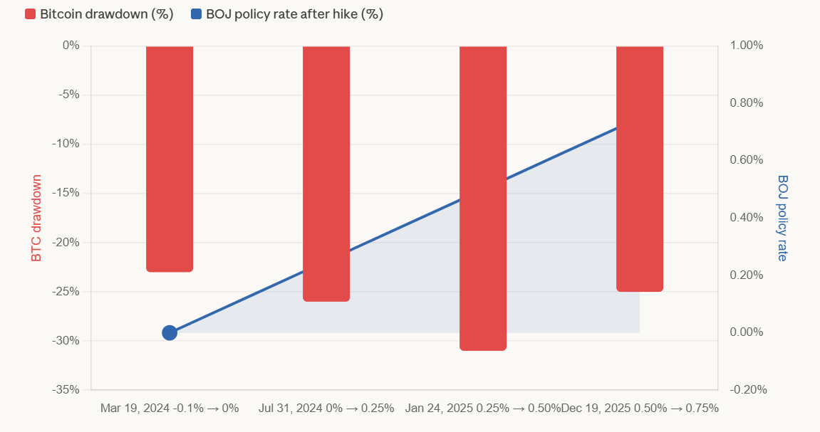 Each Bank of Japan tightening phase since 2024 has coincided with Bitcoin drawdowns of roughly 20% to 31%, driven largely by forced deleveraging rather than gradual market repricing.