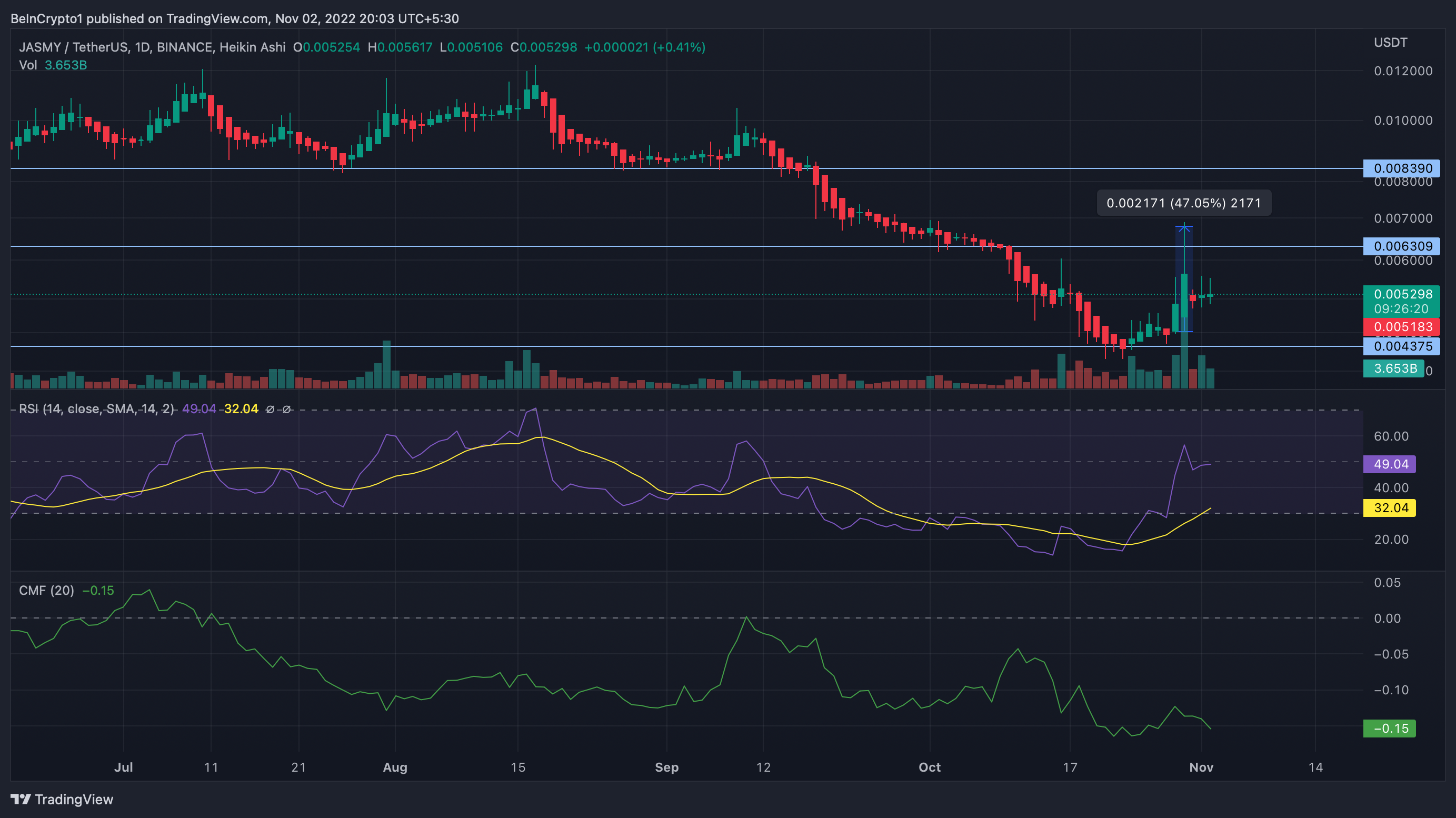 SponsoredOn Nov. 2, JASMY traded at $0.005202, a 2.12% loss on the daily time frame. A look at JASMY’s one-day price chart showed that after making a local high of $0.0068 on Oct. 30, the token’s price started to make lower highs alongside fading trade volumes.