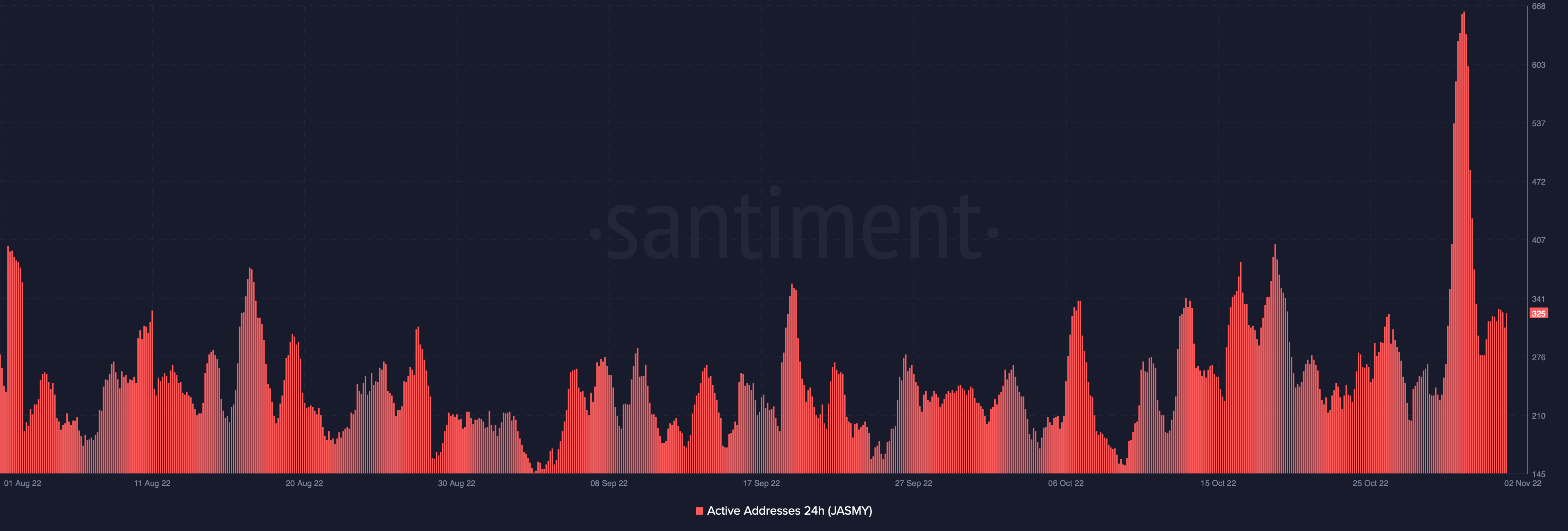 From a technical point of view, JASMY’s momentarily bullish price action seemed to be fading. However, active addresses for JasmyCoin had spiked to 662 on Oct. 31, marking a five-month-high.